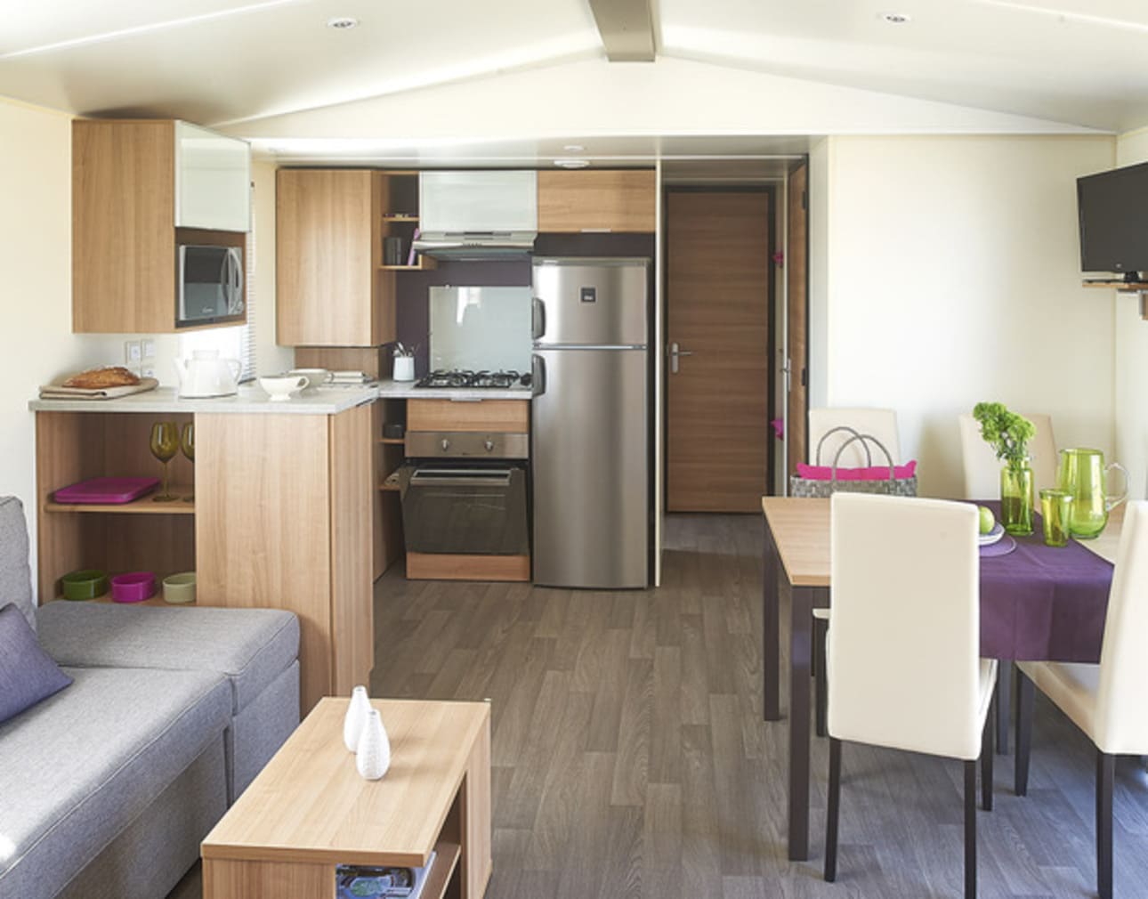 Notre mobilhome Bora Bora d’environ 40 m² est pensé pour les familles et tribus qui veulent de l’espace et du confort en toute saison.
